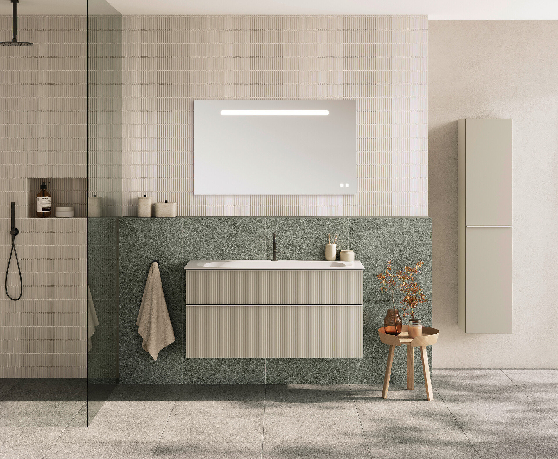 Für das Badezimmer hat Designer Patrick Frey diesen Trend zusammen mit burgbad nun praxistauglich umgesetzt: Statt der horizontalen Profilierung mit Plisseefronten bei der Originalkollektion Fiumo zeigen die neuen Fronten von Fiumo 2.0 ein vertikales Muster. Die eingefräste, thermofolierte Oberflächenstruktur wirkt dabei eher filigran als robust – ein feines Linienmuster, das dem Möbel mit seinem Schattenspiel Lebendigkeit verleiht und es weniger massiv wirken lässt. Typisch burgbad: Mit den weich ausgearbeiteten Kanneluren ist das Oberflächenrelief nicht nur besonders pflegeleicht, sondern erweist sich auch als echter Handschmeichler.